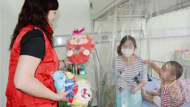 志愿者在武漢兒童醫院血液科為白血病兒童送去六一禮物