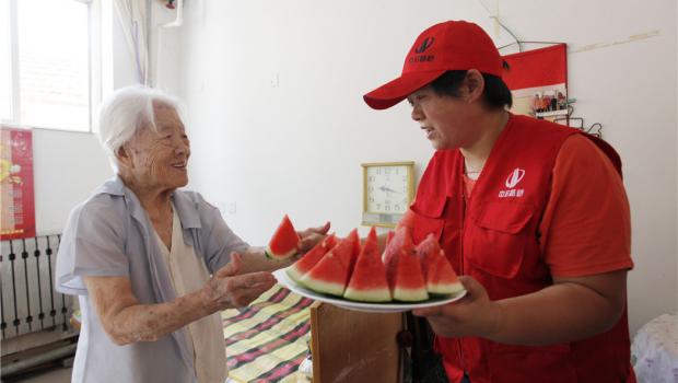 志愿者在煙臺養老院為老人送去夏日清涼