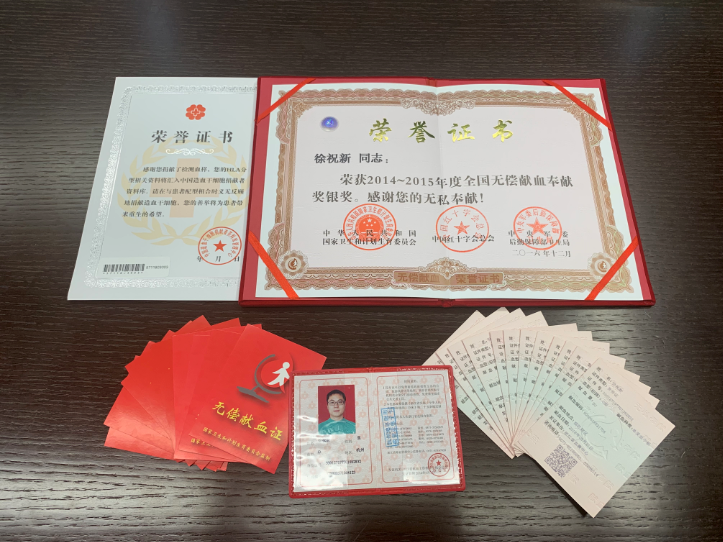 徐祝新于2014、2015年度獲得全國獻血銀獎,2016、2017年度獲得全國獻血金獎(獻血達8000cc),省內僅3000余人獲此殊榮。此外,他的夫人也是全國銅獎(獻血達4000cc)的獲得者。